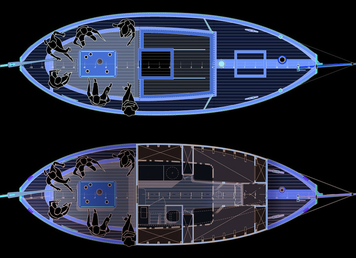 Il G-12 (sotto), top di gamma, prevede un doppio pozzetto (a prua e a poppa) e volendo doppia motorizzazione, oltre al motore elettrico, per una velocità di crociera che supera i 10 nodi.
