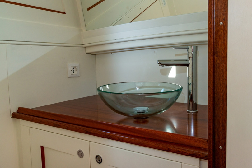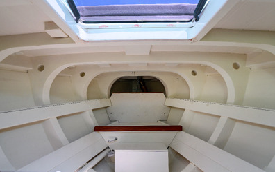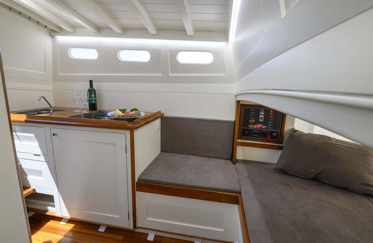 Interni - sottocoperta, altezza d'uomo in cucina e bagno. Poi due sedute e un'ampia cuccetta matrimoniale.