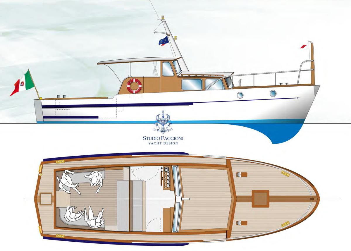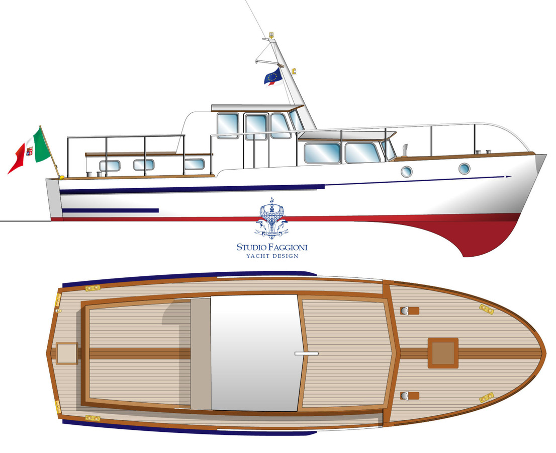 Il fasciame in mogano, in perfetto stato, verrà totalmente revisionato; coperta e sovrastrutture saranno invece rifatte integralmente.